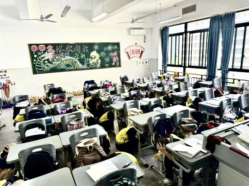 随着第一次警报声响起,各班教师立即停止授课,并告知学生“地震来了,不要慌”,指挥学生迅速抱头,躲在桌下,尽量蜷曲身体,降低身体重心,用手护在后颈部或用物品遮盖住头部。