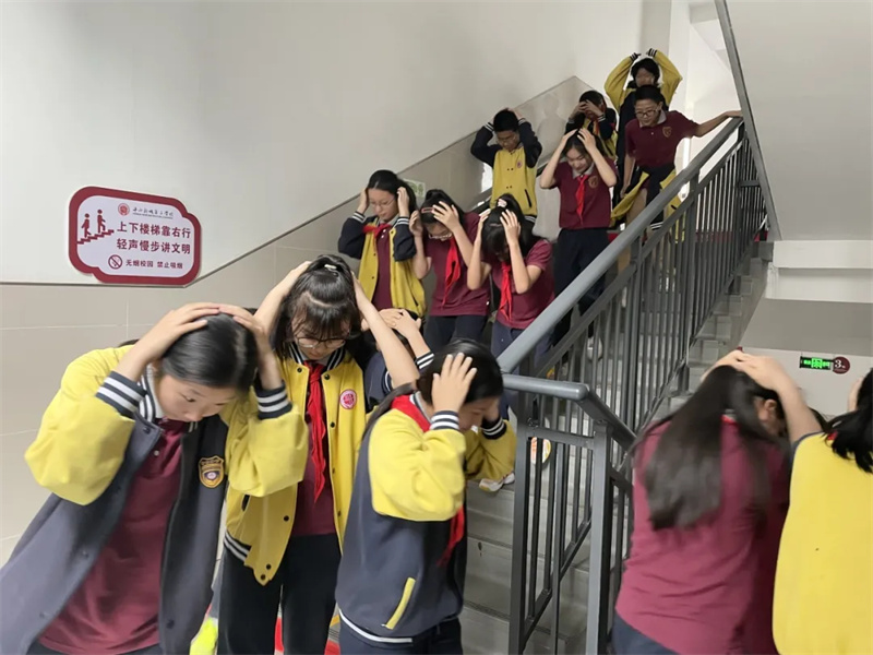 第二次警报响起,在班主任老师的带领下,同学们弯腰、护头,迅速有序按指定路线撤离到指定位置。随后,各班老师清点学生人数,确保全员安全撤离。