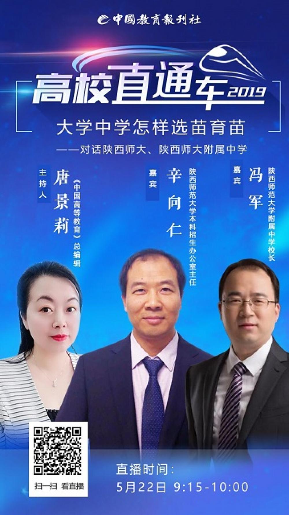 由中国教育报刊社主办的“高校直通车2019”系列访谈第七期开播。本期邀请到了陕西师范大学本科招生办公室主任辛向仁,陕西师范大学附属中学校长冯军做客直播大厅,就大学中学怎样选苗育苗相关话题进行交流...