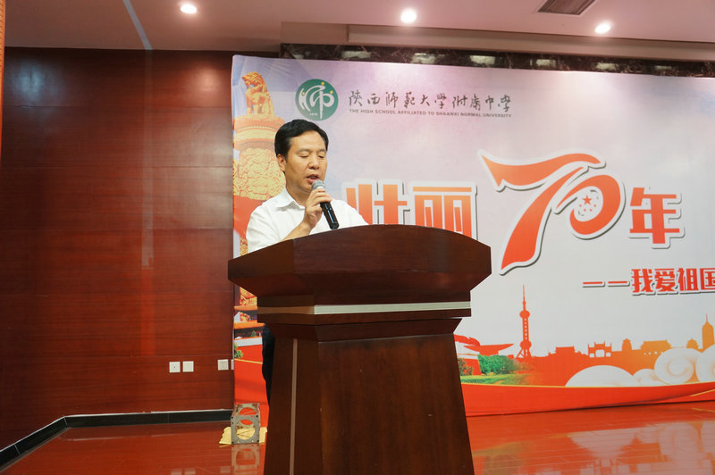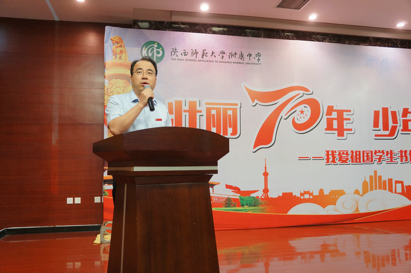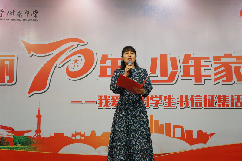 我校冯军校长致词。冯校长首先对此次活动的主办方及承办方致以真挚的感谢,冯校长讲到,爱国是成才之本,立身之基,书信作为传承中华民族文化的重要交流形式意义非凡,值此中华人民共和国成立70周年之际,我校学子通过书信的形式,积极表达,讲好新中国富强故事,讲好西安发展故事、讲好家庭变化故事,展现出新时代中学生昂扬向上的精神风貌和对祖国的一片赤子之心。希望同学们都能够珍惜此次活动的机会,从现在开始,努力学习,全面发展,努力成为信念坚定,本领过硬,品格高尚的新时代好青年!