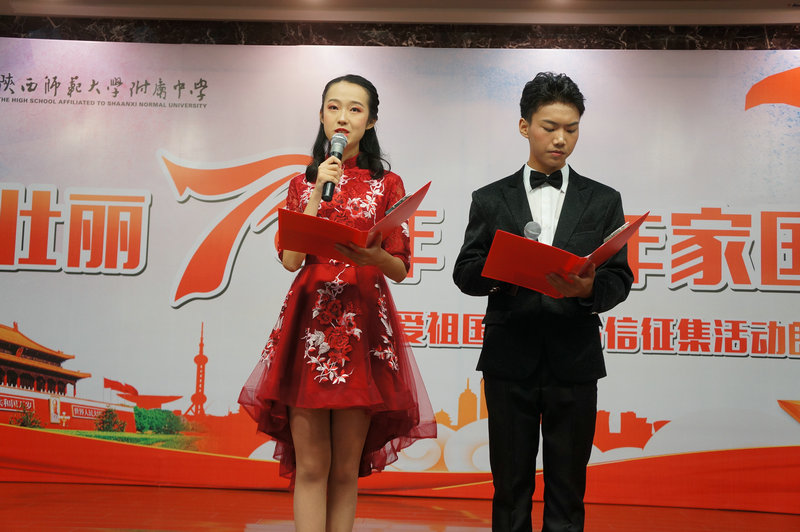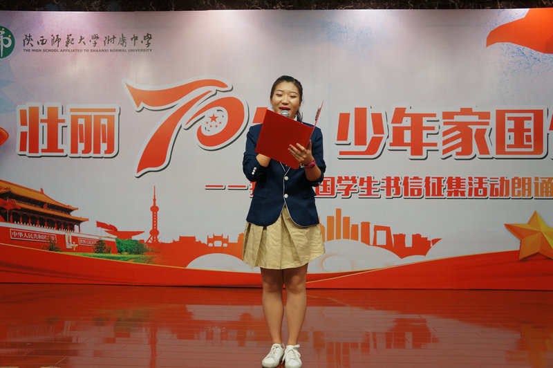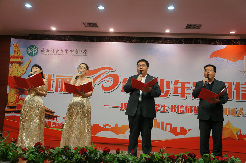 随后,陕西省朗诵协会副会长晓河为大家诵读了高二5班周佳奕的作品《我有幸》,晓河老师的诵读饱含真情,现场掌声此起彼伏,接着由我校11位广播站成员和语文教研组长万琼老师分别为大家诵读了参与此次书信征集活动的入围作品,他们是:高二1班张可璇的作品《亲爱的祖国》、高二7班李思哲的作品《我和我的祖国》、高二2班江碧薇的作品《祖国啊,我愿意做你的孩子和战士》、高二3班戴鑫艺的作品《奶奶爱上了手机支付》、分校韩静仪的作品《那时的奶奶是全西安最好饭堂的厨师》、高二3班徐伊诺的作品《与国漫共成长》、初二10班剡雪杭的作品《垃圾分类后再来看大美西安》、高二1班王子竹的作品《万水千山,你是最深的牵挂》、高二2班郭婧语的作品《祖国,我这样理解你》、高二5班向艺颖的作品《最美乐章》,各位诵读者声情并茂、铿锵有力、热情激昂的表现力时而将现场观众带去了祖国辽阔的田野、时而又让大家目睹了祖国70年来日新月异的发展与变化,大家用语言的艺术向现场观众传递着书信的思想内容,倾诉和表达着对未来、对梦想、对亲人的问候和祝福,对家乡、对祖国的满腔热爱,引起现场观众的共鸣。其中,我校高一3班罗今一与问丁元老师带来的一首《我爱你中国》掀起了此次活动的高潮,大家一起唱响红歌,轰动全场!