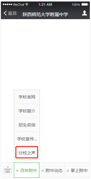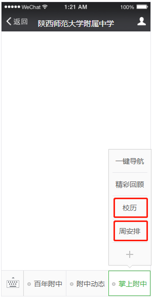 为进一步优化陕西师大附中官微下拉菜单结构,完善栏目服务功能,提供方便、快捷的信息查询方式,学校办公室对官微下拉菜单板块进行了调整,内容如下: