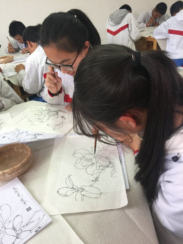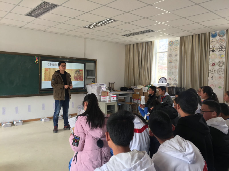挑战和苦难固然存在,只有积极面对,努力克服才能攀登人生新的高峰。所以从接到任务的当晚开始,吴潇潇老师便投入到紧张的准备工作中,为了适应八一中学美术教学的需要,吴潇潇同志不断地思考、探索适应当地新的教学方式,开设课前三分钟美术小讲堂,让学生自做课件自讲述,注重激发和培养藏区学生学习美术的兴趣和自主学习的能力。为了达到教学最优化,吴潇潇同志除了与当地美术教师探讨沟通外,还根据当地的学生实际情况,自编中国画课程《中国传世十大绘画作品》,并制作精美课件讲授,丰富讲授内容,让学生们感受中国传统文化,提高鉴赏能力。在课堂内,始终以饱满的热情和诙谐的语言吸引学生,以通俗的讲解和耐心的辅导抓住学生,以丰富的知识和宽广的视野感化学生,努力使不同层次的学生都能够发展、进步。同时,还特别注重形成性评价在美术教学中的运用,及时鼓励学生,尽量让不同层次的学生体验到美术学习的快乐,树立绘画学习的信心,努力构建更加开放、和谐、高效的课堂,让学生在轻松、愉快的氛围中学习。在课堂外,鼓励学生积极参加“手绘中国地图”“礼赞70年”等一些系列绘画比赛,并取得了众多优异成绩。