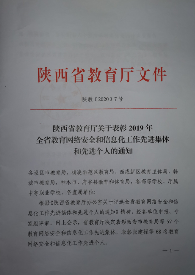 近日,陕西省教育厅印发《关于表彰2019年全省教育网络安全和信息化工作先进集体和先进个人的通知》,我校荣获“2019年全省教育网络安全和信息化工作先进集体”称号。冯军同志被授予“2019年全省教育网络安全和信息化工作先进个人”荣誉称号。