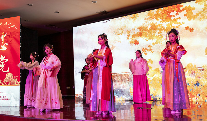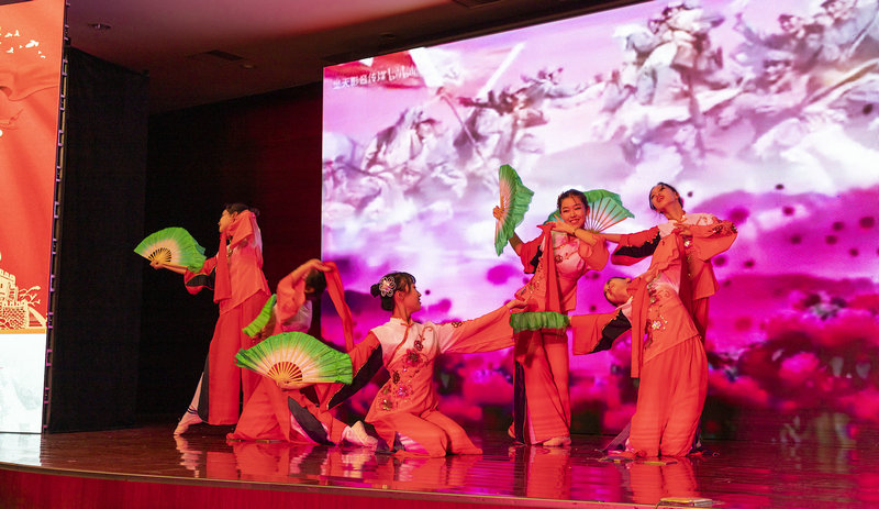 接着,我校校本选修课程及社团成员为大家带来了一场丰富的视觉盛宴,各个社团精心准备,节目精彩纷呈。合唱社团为大家带来了合唱歌曲《春日偶成》,优美的旋律将全场每一位观众的热情瞬间点燃;汉服与古代文化社团的成员为大家带来了舞蹈《花月成双》,翩翩舞姿引领大家一起感受了古典与现代交融的舞蹈魅力,观众们陶醉其中,喝彩声不断;文学名著与影视剧赏析社团成员为大家带来了舞台剧朗诵《红岩魂》,该节目追随历史的光辉与英雄的荣光,带领大家感受风云变幻的时代中永不磨灭的国魂;健身社团部分成员为大家带来了健身综合训练展演,他们青春健美,步履矫健,身披一身灿烂,以奋进的姿态,展示着生命的蓬勃与绚烂;播音与主持社团成员为大家带来的配音节目《传承先烈遗志共筑强国盛世》带领大家感受时代的变迁和祖国峥嵘的发展历程,以及亿万中华儿女的爱国之心。