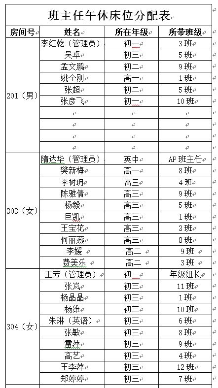根据政教处提供的班主任名单及学校《陕西师大附中午休用房管理办法》,经班主任老师申请,现已将班主任午休床位进行重新分配,为了便于监督和监管,现将班主任午休床位分配情况公示如下: