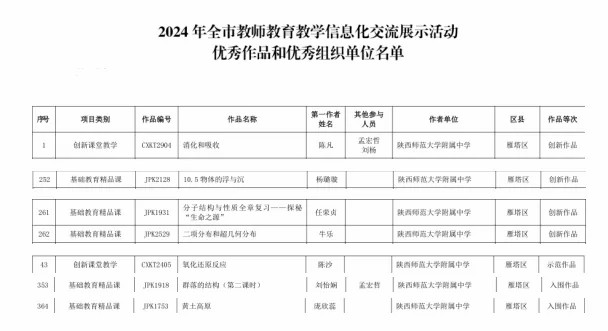 2025年1月9日,西安市教育局发布《关于公布2024年全市教师教育教学信息化交流展示活动评选结果的通知》,我校陈凡、孟宏哲、刘杨三位老师的创新课堂教学课例“消化和吸收”荣获创新作品奖(一等奖);杨璐璇老师基础教育精品课案例“物体的浮与沉”荣获创新作品(一等奖);任荣贞老师基础教育精品课案例“分子结构与性质全章复习——探秘生命之源”荣获创新作品(一等奖);牛乐老师基础教育精品课案例“二项分布和超几何分布”荣获创新作品(一等奖);陈沙老师创新课堂课例“氧化还原反应”荣获示范作品(二等奖);刘怡娴、孟宏哲老师基础教育精品课案例“群落的结构(第二课时)”荣获入围作品(三等奖);庞欣蕊老师基础教育精品课案例“黄土高原”荣获入围作品(三等奖)。