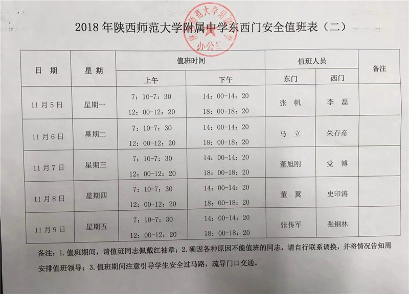 2018年陕西师范大学附属中学东西门安全值班表