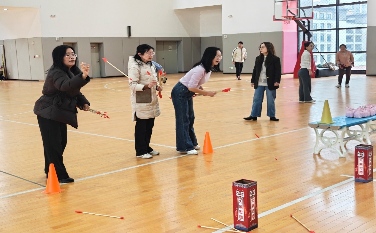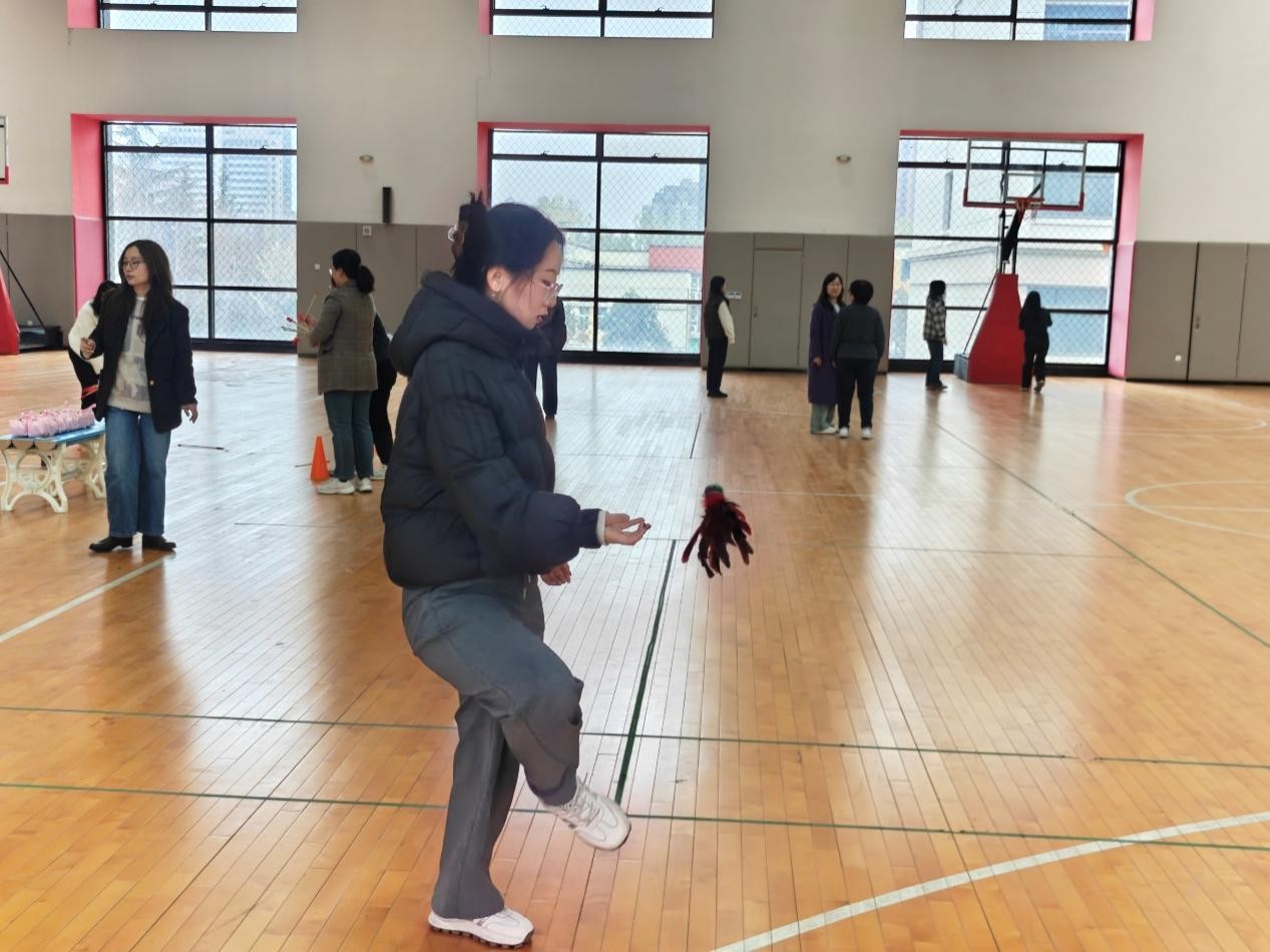同一时间,趣味运动会在长安校区体育馆内火热进行。活动设置了“一分钟投篮”“一分钟踢毽子”“一分钟投壶”三个计时项目,女教工们可根据自己的兴趣爱好选择参加。投篮区,老师们瞄准篮筐、轻盈出手;踢毽子区,彩毽飞舞、身姿灵动;投壶区,屏息凝神、箭矢入壶——每一次投中都引来阵阵喝彩。大家热情高涨、各显身手,在运动中释放压力,在欢笑中增进情谊,充分展现了女教职工健康向上、充满活力的精神风貌。