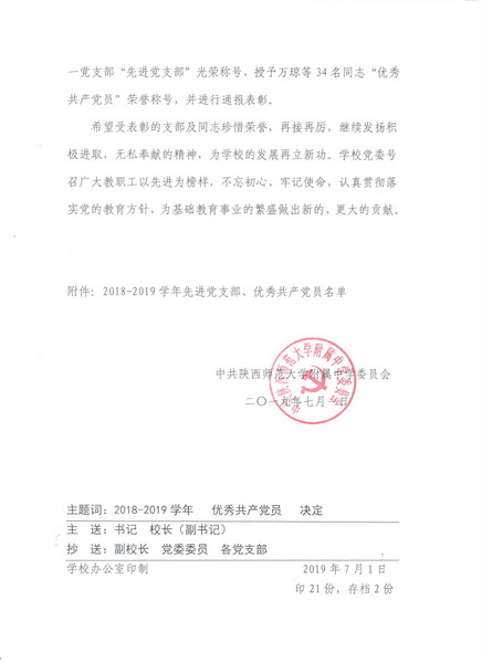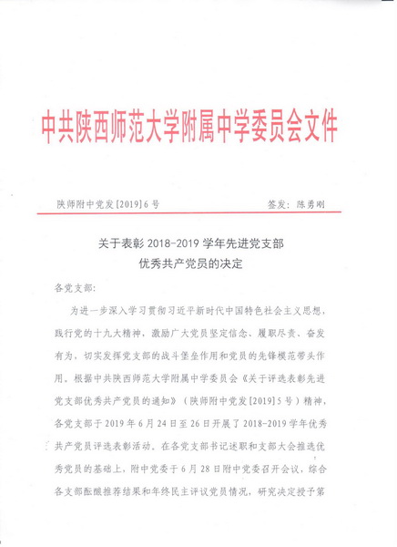关于表彰2018-2019学年先进党支部、优秀共产党员的决定